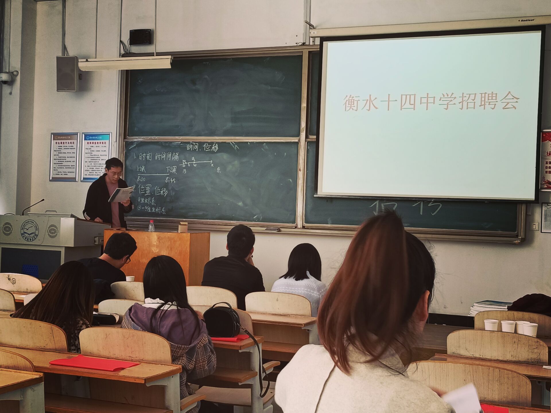 招聘会上,衡水市第十四中学的招聘负责人通过播放公司的宣传片、PPT的方式向大家详细的介绍了衡水市第十四中学的基本信息、师生源情况、毕业生上线率等,让大家更好的了解了衡水市第十四中学。衡水市第十四中学是衡水市桃城区唯一一所国办重点高中,为公司毕业生提供了良好的工作平台。在招聘会现场,公司的老师对同学们如何根据自己的实际情况选择适合自己的职业岗位等方面提供了就业指导和建议。