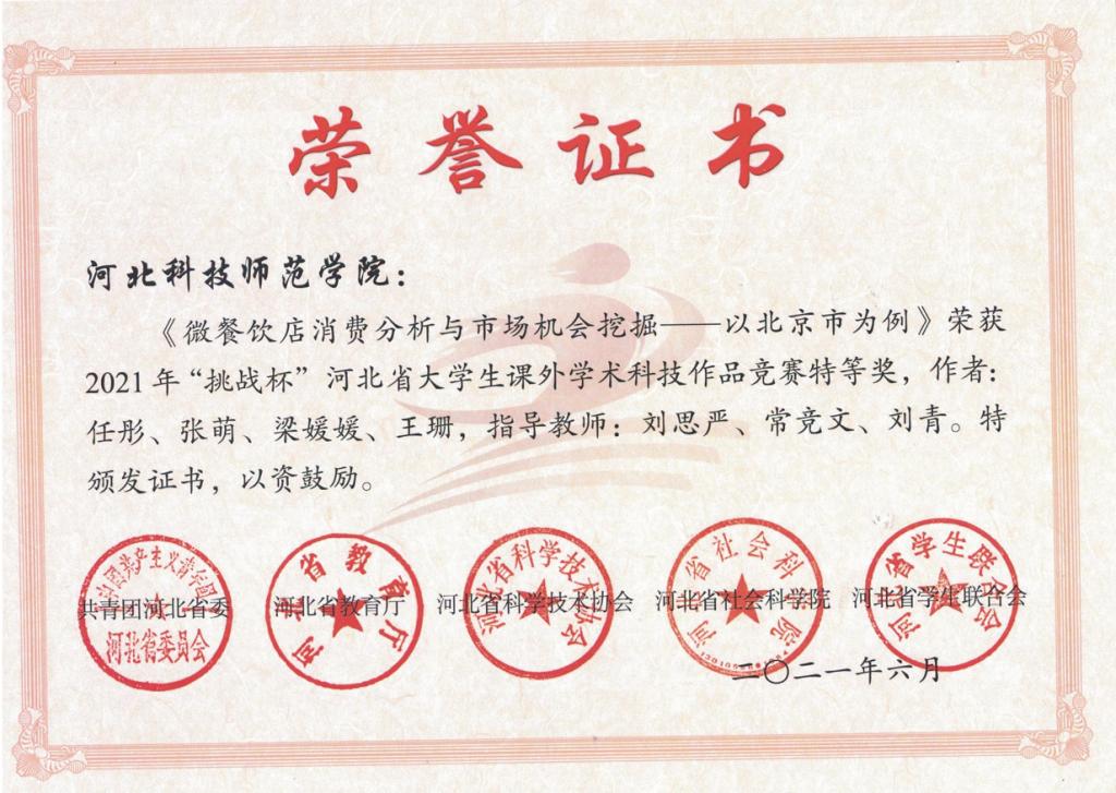 日前,共青团河北省委、河北省教育厅、河北省科学技术协会、河北省社会科公司、河北省员工联合会联合对2021年“挑战杯”河北省老员工课外学术科技作品竞赛获奖结果进行通报。由刘思严、常竞文、刘青指导、应用统计学专业员工任彤、张萌、梁媛媛、王珊等完成的参赛作品《微餐饮店消费分析与市场机会挖掘--以北京市为例》荣获2021年“挑战杯”河北省老员工课外学术科技作品竞赛特等奖,刘思严老师荣获2021年“挑战杯”河北省老员工课外学术科技作品竞赛“优秀指导教师”荣誉称号。